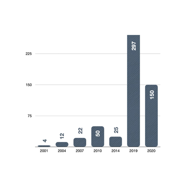 El número de presupuestos participativos ha descendido algo con respecto a su máximo histórico, de 350 procesos durante el mandato 2015-2019. A pesar de ello, continúa siendo una práctica mucho más extendida que en cualquier período anterior.